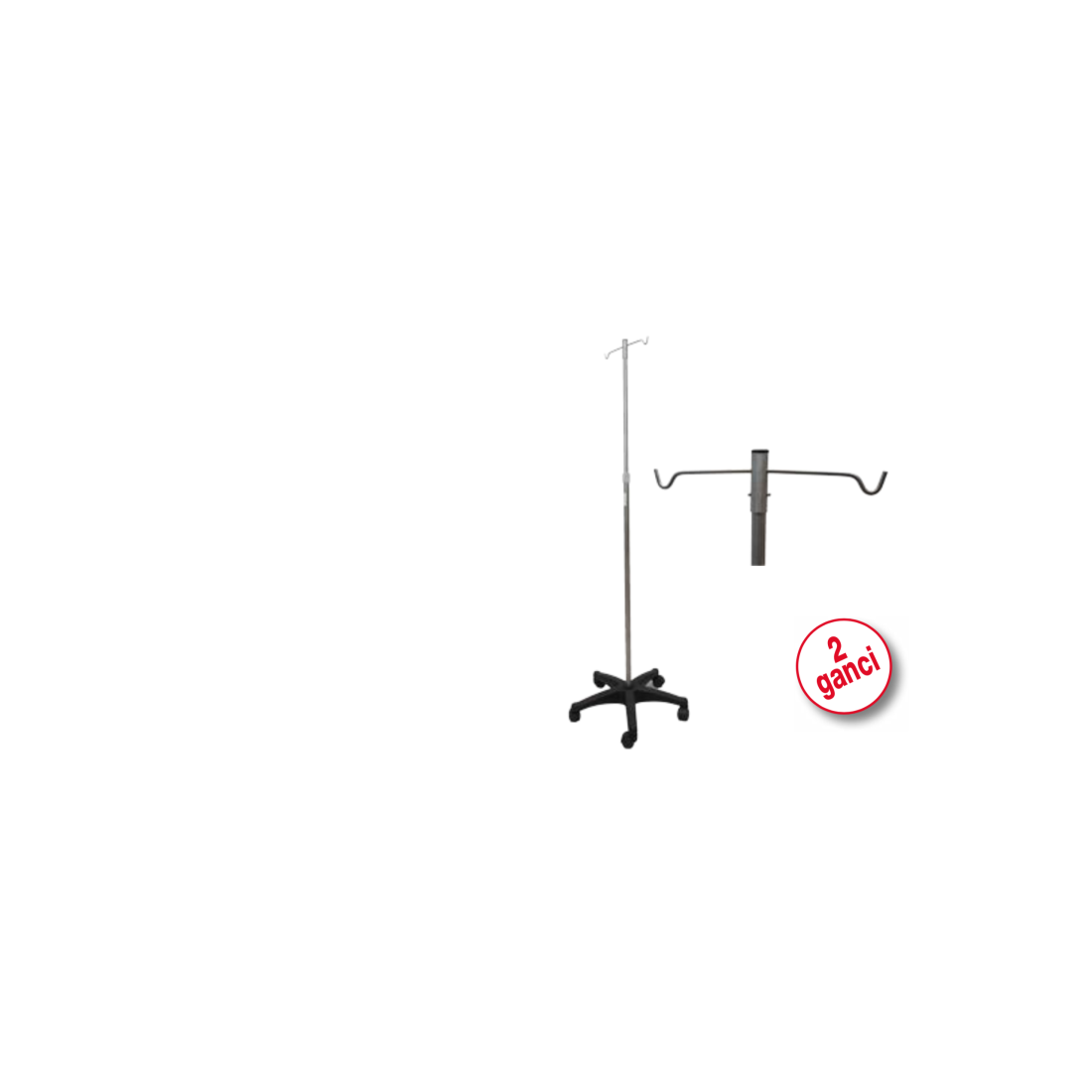 Asta porta-flebo con base in plastica nera a cinque razze su ruote piroettanti. Struttura in tubolare di acciaio cromato. Regolabile in altezza grazie all’apposita manopola. Corredata di doppio gancio porta-flebo.