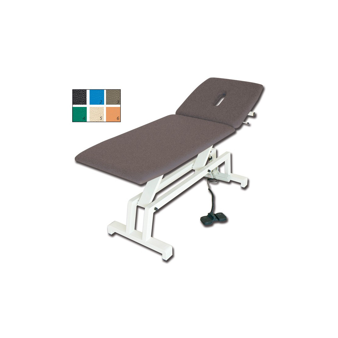 Lettino visita e trattamenti, robusto ed estremamente stabile. Altezza regolabile attraverso comando elettrico a pedale. Sezione gambe fissa e testata con foro naso e bocca regolabile manualmente.