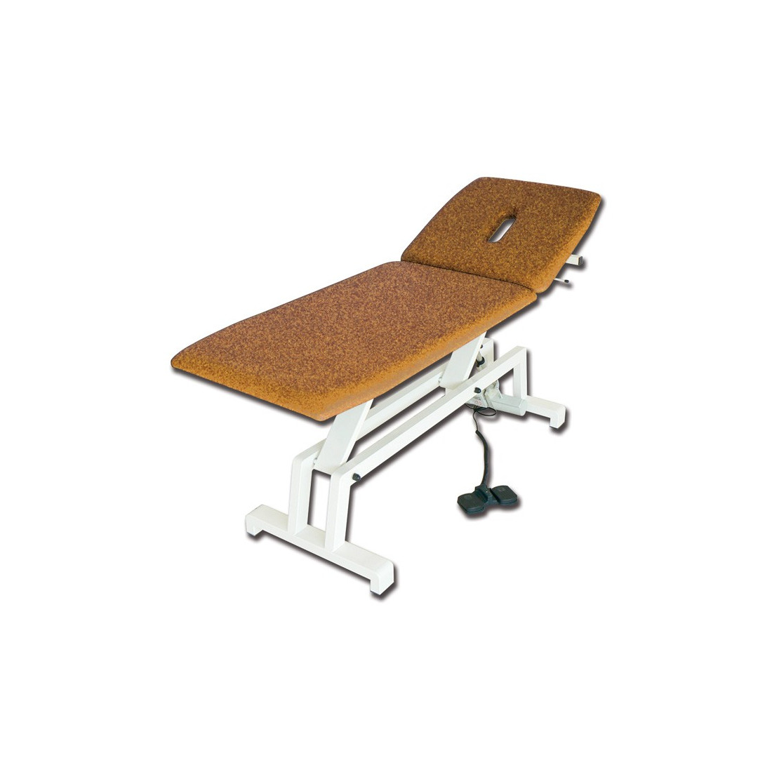 Lettino visita e trattamenti, robusto ed estremamente stabile. Altezza regolabile attraverso comando elettrico a pedale. Sezione gambe fissa e testata con foro naso e bocca regolabile manualmente.