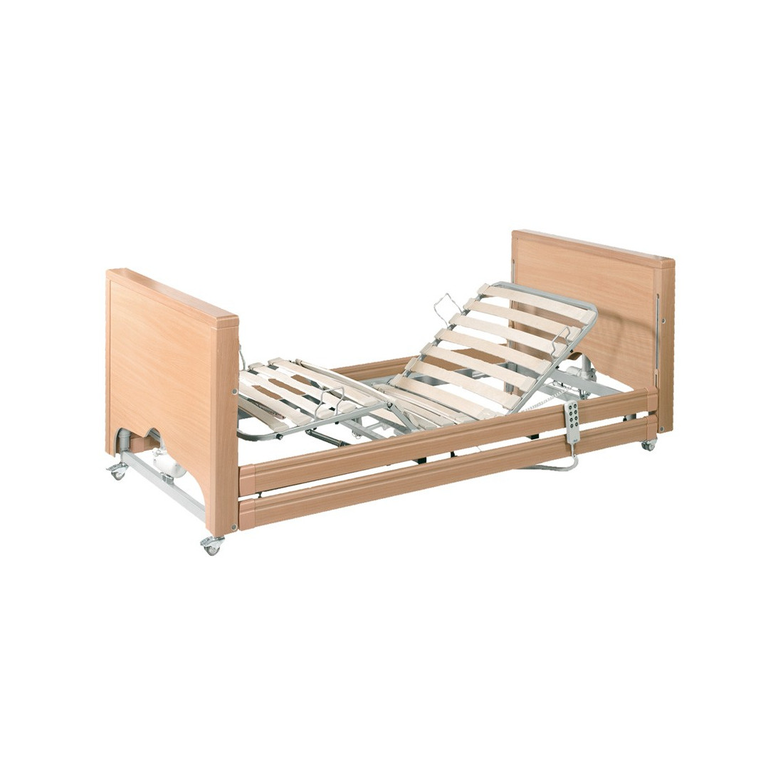 Letto a 3 snodi, quattro sezioni con altezza regolabile da 23 a 63 cm con movimenti completamente elettrici. Struttura interamente saldata costruita in profili di acciaio a sezione rettangolare 50 x 25 x 2 mm. Piattaforma materasso con doghe flessibili in legno, completa di guide reggi materasso. Sezione alzatesta e sezione gambe regolabili a mezzo di due motori elettrici 24V DC indipendenti e pulsantiera. Sezione piedi regolabile a mezzo cremagliera. Possibilità di movimento Trendelenburg (12°) e anti-Trendelenburg (12°). Sezione bacino fissa. Testiera e pediera asportabili con bordi in legno massello. Gambe con 4 ruote girevoli Ø 100 mm con freno centrale indipendente.