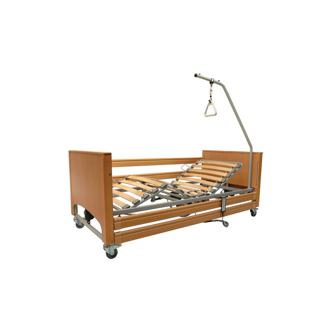 Sezione alzatesta e sezione gambe regolabili a mezzo di due motori elettrici 24V DC indipendenti e pulsantiera. Sezione piedi regolabile a mezzo cremagliera. Sezione bacino fissa. Possibilità di movimento Trendelenburg (12°) e anti-Trendelenburg (12°).Testiera e pediera asportabili con bordi in massello di legno.