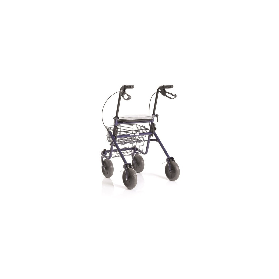 4 ruote piene di Ø 20 cm. Ruote frontali piroettanti, ruote posteriori fisse. Dotato di freni sulle ruote posteriori a doppia funzione. Impugnature anatomiche regolabili in altezza per il massimo comfort. Facilmente pieghevole per essere riposto e trasportato. Fornito con sedile, vassoio e cestino porta oggetti.